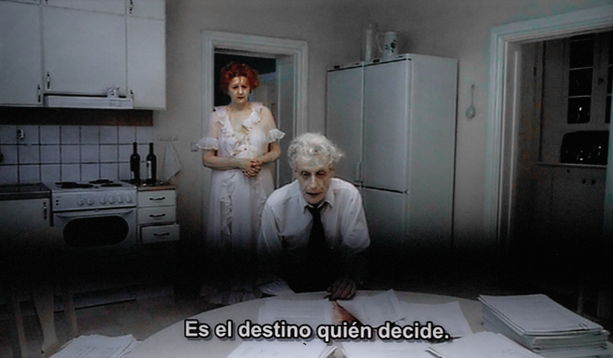 La Fotografía: Película: La comedia de la vida, de Roy Andersson (2007). En este fotograma, soy el tipo, aproximadamente igual de viejo, pero sin pelo y con las mismas sospechas sobre el poder de la predestinación; pero detrás de mí no hay ninguna mujer como la del fotograma (menos mal, sería una aciaga jugarreta del destino).