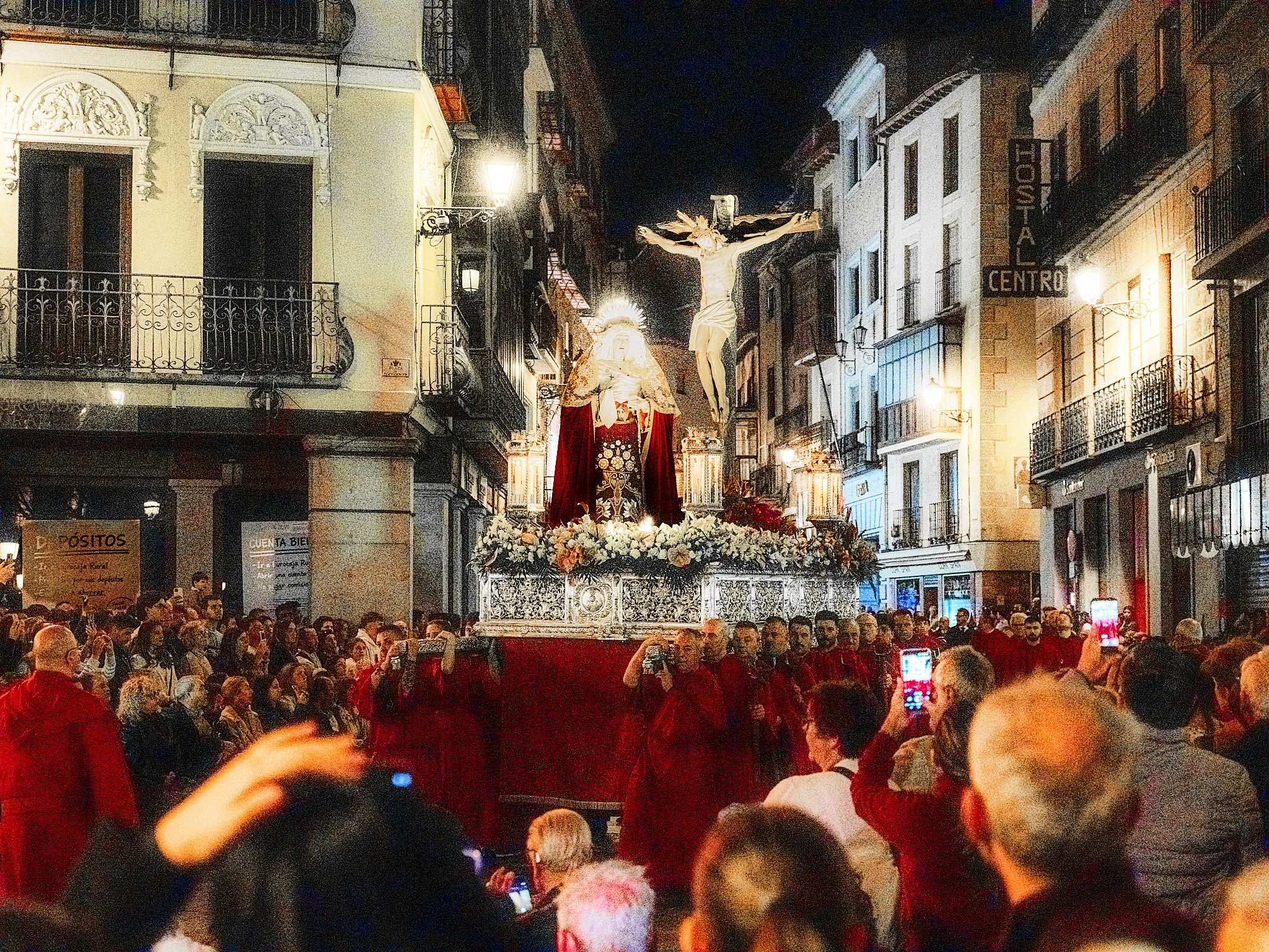 En la plaza estábamos cientos de personas, incluso mil, y por las calles muchas más, y esperábamos para ver pasar una lujosa, aunque tristona, exhibición material de las creencias; eso sí, con acompañamiento musical de tambores, trombones y platillos.