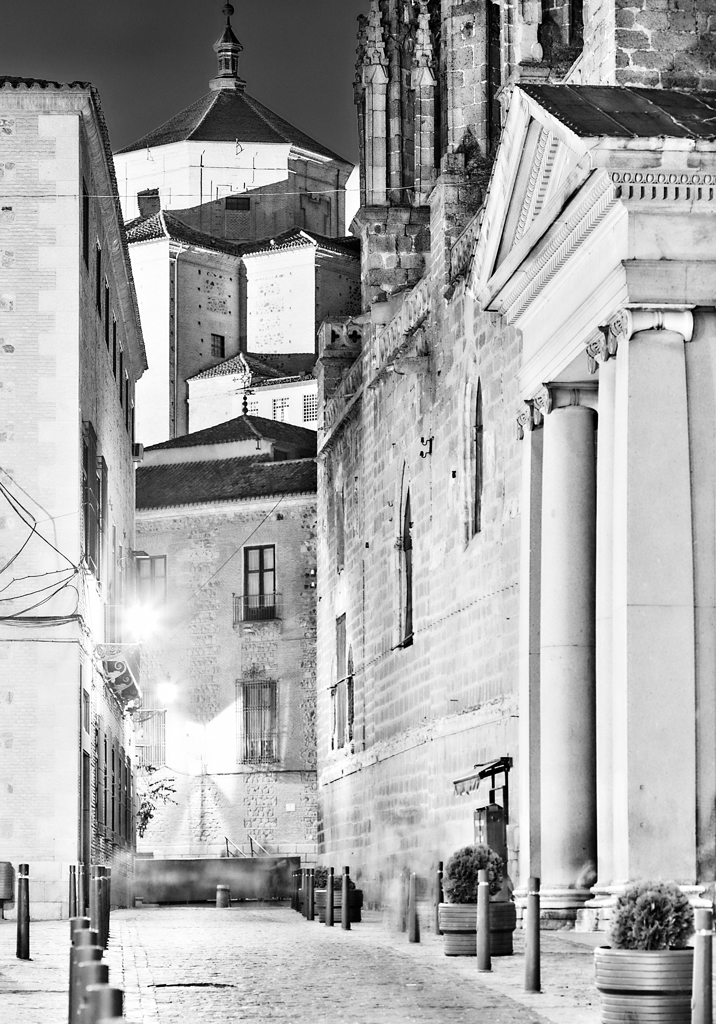 La Fotografía: La ciudad, en pleno reposo, una vez que las figuras divinas de material no sé si orgánico o inorgánico, pero lujosamente vestidas, y sus acompañantes: los ciudadanos de aquí y los visitantes de fuera; aficionados y los profesionales del asunto: curas, cofrades y otros inespecíficos, ya se habían retirado a descansar inocentemente, sin pena ni culpa. Quedé yo con mi vieja cámara RB67, cuando era analógico (2009), ahora, ya solo soy digital y superfluo.