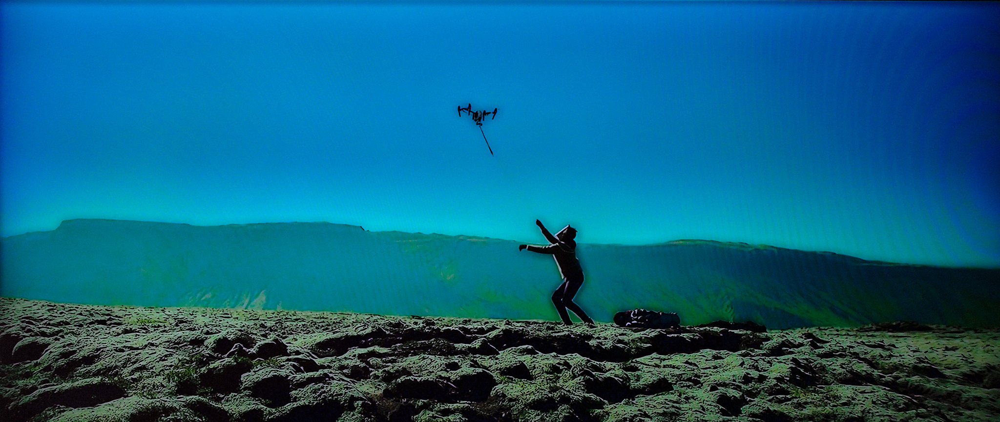 La Fotografía: Imagen de la película mencionada. La mujer de la montaña, luchando denodadamente para abatir al dron que la perseguía con malas intenciones, con una careta de Nelson Mandela (todo un guiño a la imbatible idea del compromiso).
