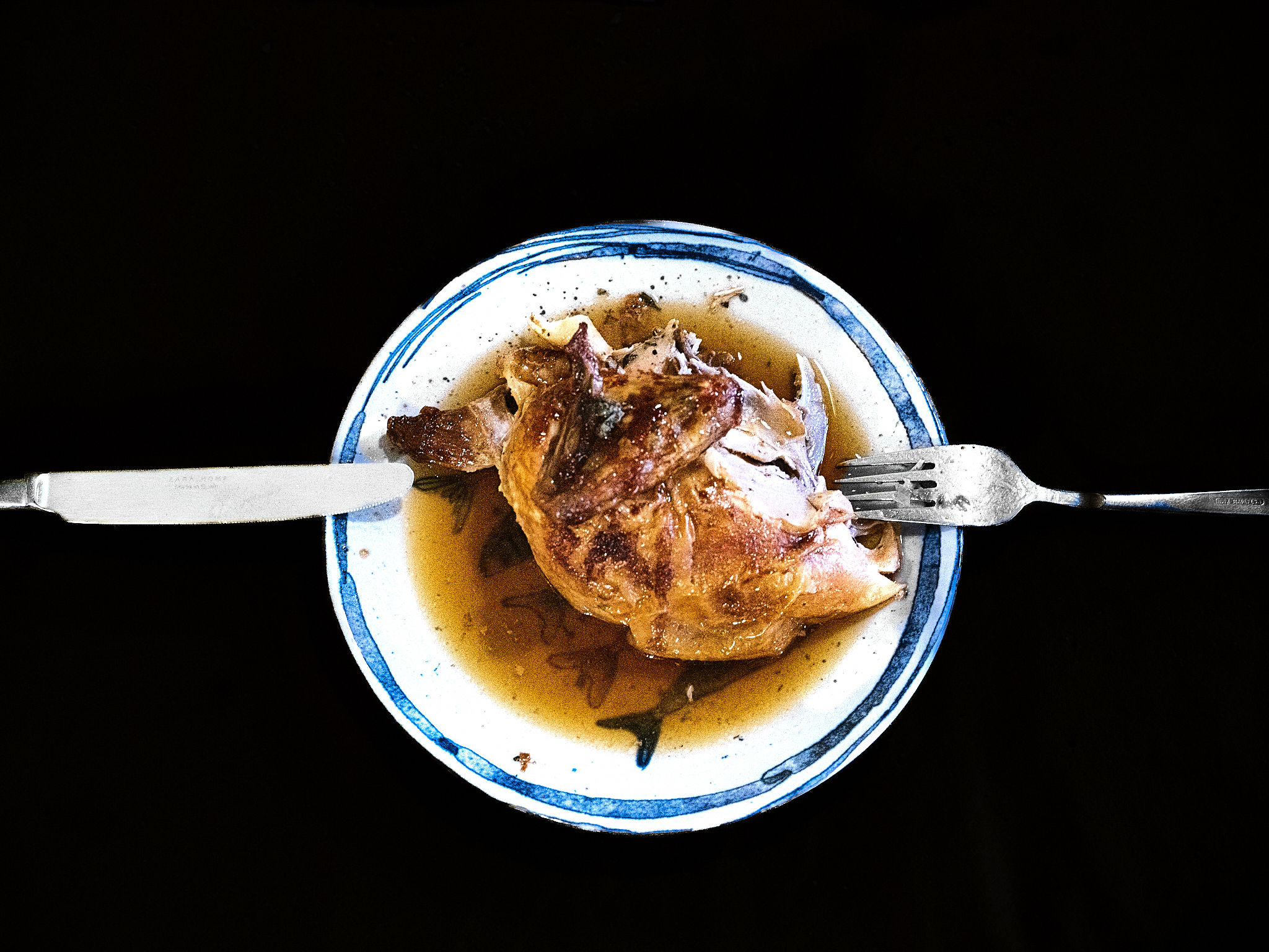 La Fotografía: Uno de los síntomas de mi galopante vejez es que, de un año a esta parte, me apetece menos cocinar, ya casi nada. Inadvertidamente, debo estar preparándome psicológicamente para las comidas del asilo, que me las darán hechas. Así que compro mucha comida cocinada por los empleados de Mercadona, o por la Rebe, la que vende comida en mi barrio para gente como yo. Por ejemplo, esta pechuga de un pollo entero asado que me compré ayer, me la comí a mediodía, tan contento.