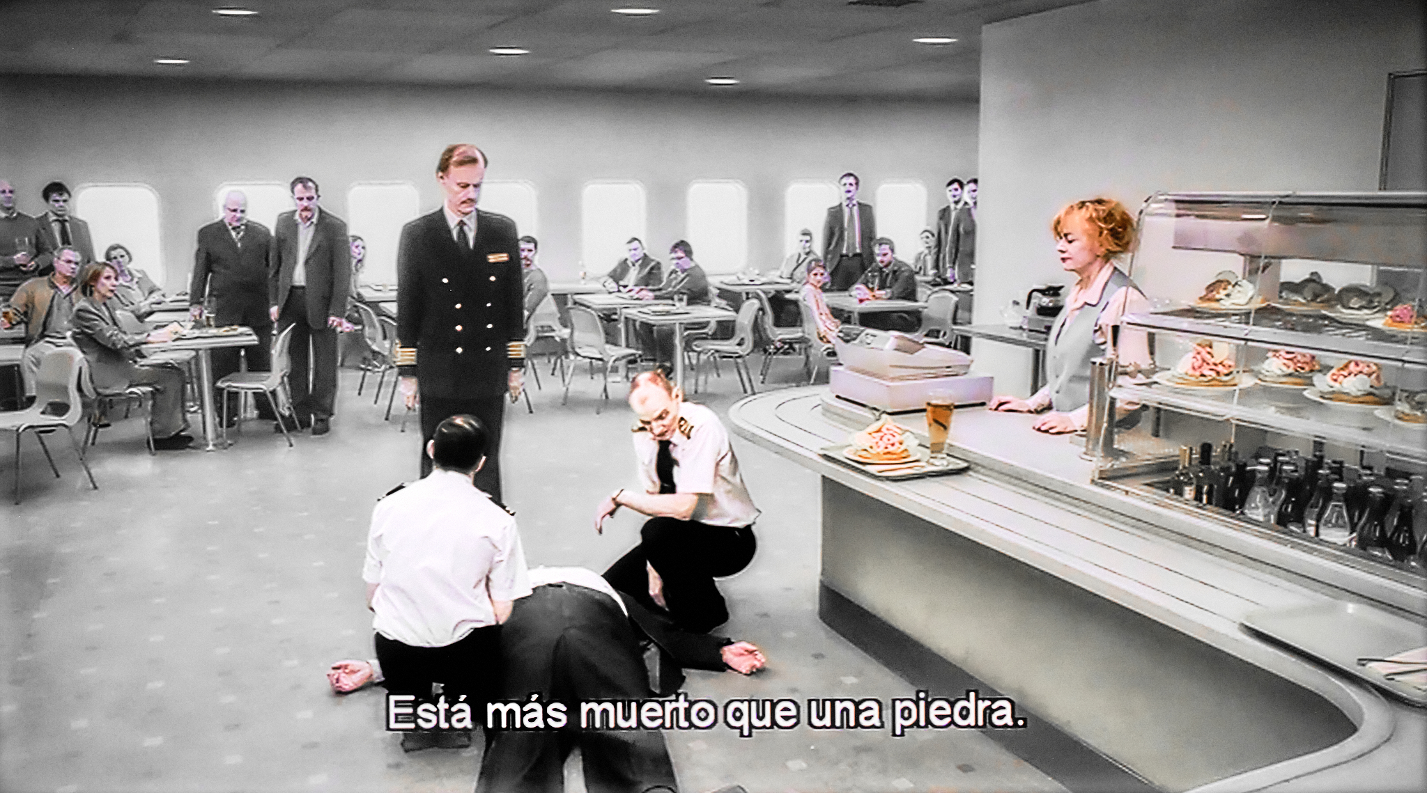 La Fotografía: Roy Andersson, otra vez: Una paloma se posó sobre una rama a reflexionar sobre la existencia (2014). Comienza con tres encuentros con la muerte. Este fotograma, del número 3, con especial significación y atención en la bandeja de comida del muerto pagada ya y que sobra, como el propio muerto.