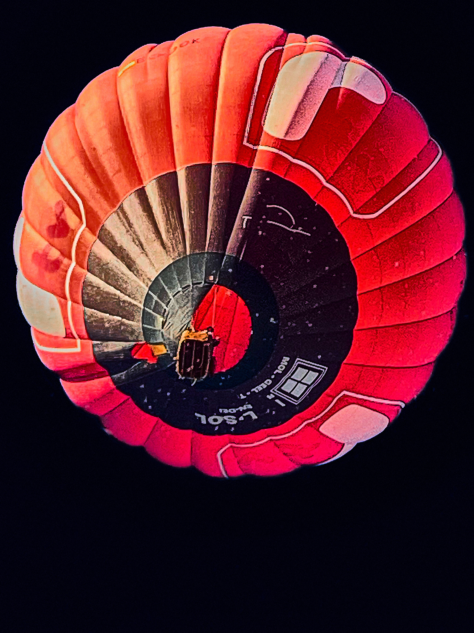 La Fotografía: Cuando me acercaba al final del paseo por la senda, un globo aerostático se ha colocado encima de mi cabeza, con los característicos ruidos asmáticos intermitentes del fuego que genera aire caliente que en contacto con el frío lo hace volar (desconocía ese principio, pero acabo de mirarlo en Google) ¡qué sería de nosotros sin Google!. Los tripulantes se asomaban al borde de la barquilla que, a mí, más bien, me parece una cesta. Por cierto, estos globos empezaron a funcionar en el s XVIII. Hay que ver cuánto se aprende a partir de salir a caminar inocentemente un domingo por la mañana. Cuando me alejaba, el globo aterrizó suavemente mientras un todo terreno con remolque atrochaba por un barbecho para cargar con el globo, los aparejos y los tripulantes, supongo (no creo que volvieran a su casa andando después de haber volado). Muy aerodinámico y colorido todo, hoy, domingo por la mañana.