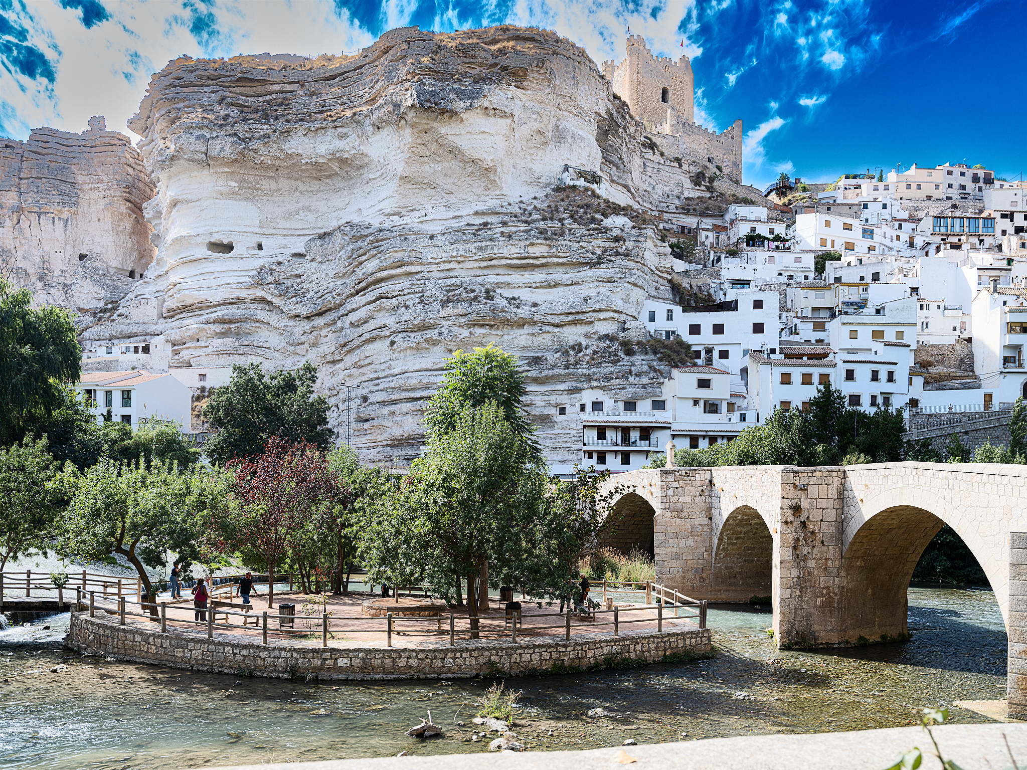 La Fotografía: Estoy olvidando de incluir datos culturales e históricos y para eso es para lo que viajo, además de por cuestiones existenciales (en liquidación). «Alcalá de Júcar está catalogado como uno de los pueblos más bonitos de España y pertenece desde 2014 desde entonces a la asociación homónima». (Wikipedia). Por eso fui hasta tan lejos. El castillo que solo vi por fuera: Siglo XI en su origen almohade. En el siglo XIII pasó a dominio cristiano, en época de Alfonso VIII. Constituido por un torreón pentagonal y dos torrecillas de planta circular. La fotografía la tomé desde al lado mismo donde comí y los amantes cincuentones se fotografiaban, en esa especie de isla al lado del puente, reconstruido siguiendo las trazas originales romanas (s XVIII).