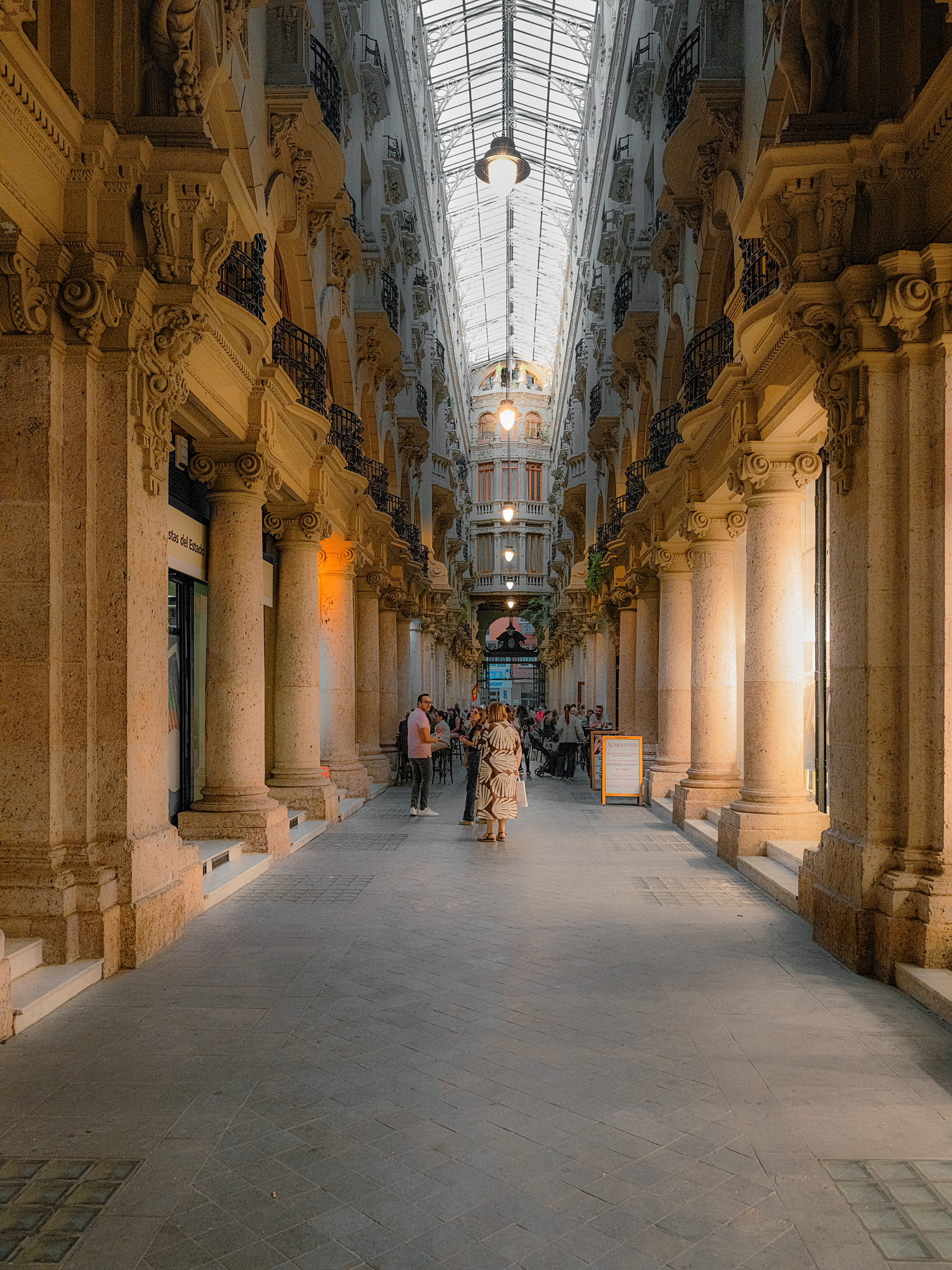 La Fotografía: De traza modernista, copiado de las galerías comerciales italianas, Milán, Nápoles, o Roma, que recuerde ahora, todas ellas del s XIX y parecidos estilos. La de Albacete, interesante y sofisticada, aunque no tanto como las italianas, sensiblemente más pequeña, tenía decoración modernista, neobarroca y columnata renacentista. El pasaje me pareció estimable y lejano, algo exagerado. No me emocionó.