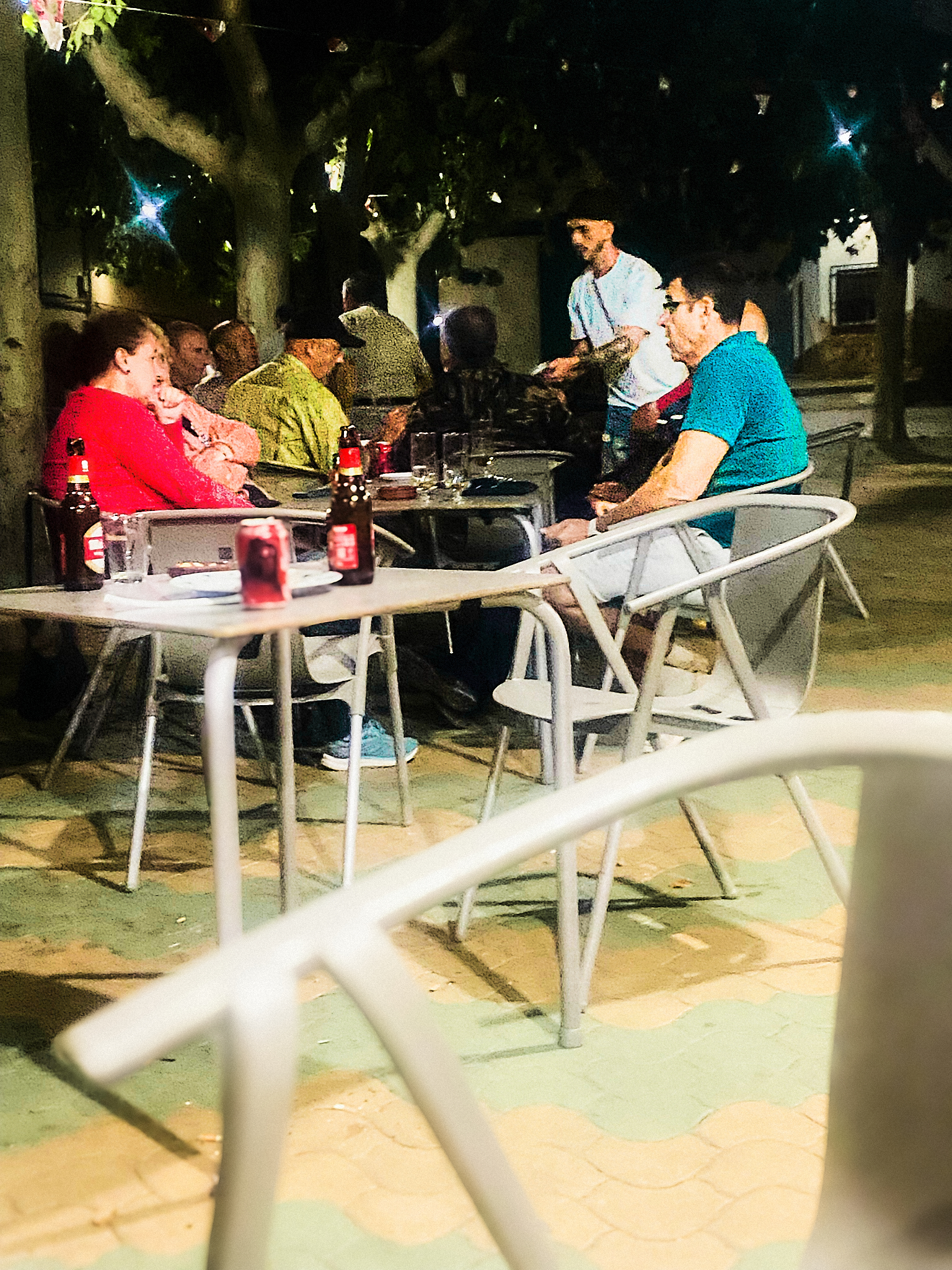 La Fotografía: El bar, a un lado de la calle, al otro las mesas de la terraza, donde había primero dos mesas ocupadas y luego solo una. Todos estaban juntos, como en familia, sin serlo (supongo). El bar lo atendía un chico joven tatuado, muy desenvuelto y expeditivo. Pastoreaba con autoridad a los clientes habituales, y a mí, que me trató igual que a ellos. Tardó una eternidad en servirme una oreja de cerdo a la plancha, nadando en aceite y una cerveza (un asco de cena). Mientras cené se concentró en una de las mesas una tertulia de seis o siete tíos del pueblo, que hablaban alto y sin miramientos. Reían fuerte las gracias de unos y otros. Comentaban lo que parecían ser las cosas cotidianas del pueblo y de sus vidas, que les hacía mucha gracia, además. Es lo que tiene vivir en lugares chicos, me parece, que nadie está solo, todos se conocen y hablan y ríen todos con todos y de todo. Sacan a la calle su humanidad, la confianza y la conformidad con sus vidas y el lugar donde viven. Daba gusto verlos. Seguramente llevaban todo el verano y todos los veranos reuniéndose al fresco en ese bar y a esas horas, para compartir las cosas que les pasaban. Parecían felices y agradecidos.