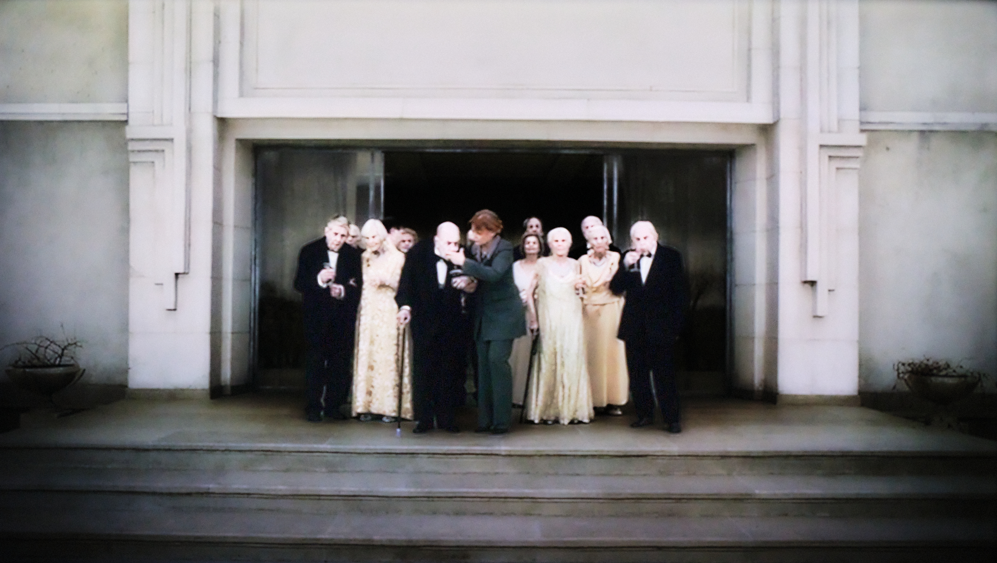La Fotografía: Viejos chochos (pero ricos), vistos por Roy Andersson en una de sus películas: Una paloma se posó sobre una rama a reflexionar sobre la existencia (2014).
