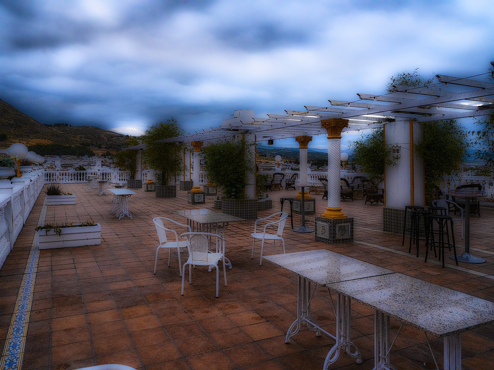 La Fotografía: La hija del Hidalgo mayor (suponiendo que se llamaran así), en la amable conversación que tuve con ella en el bar, me ofreció subir por la mañana a la terraza del hotel por si me interesaba fotografiar, ya que se divisaba una panorámica del pueblo y de la plaza de toros. La puerta estaría abierta, me dijo. Sonaba clandestino. Eso me gustó. El domingo temprano, subí, claro. Y, efectivamente, la plaza de toros estaba debajo mismo de la terraza (desde donde se podían ver las corridas como en la propia plaza, o mejor. Al fondo el pueblo. Fotografié ambas atracciones; pero lo que me interesó infinitamente más, fue la propia terraza, grande, con mobiliario de fiesta y copas, pero que parecía que hacía tiempo que la fiesta había acabado. Emitía señales inequívocas de decadencia.