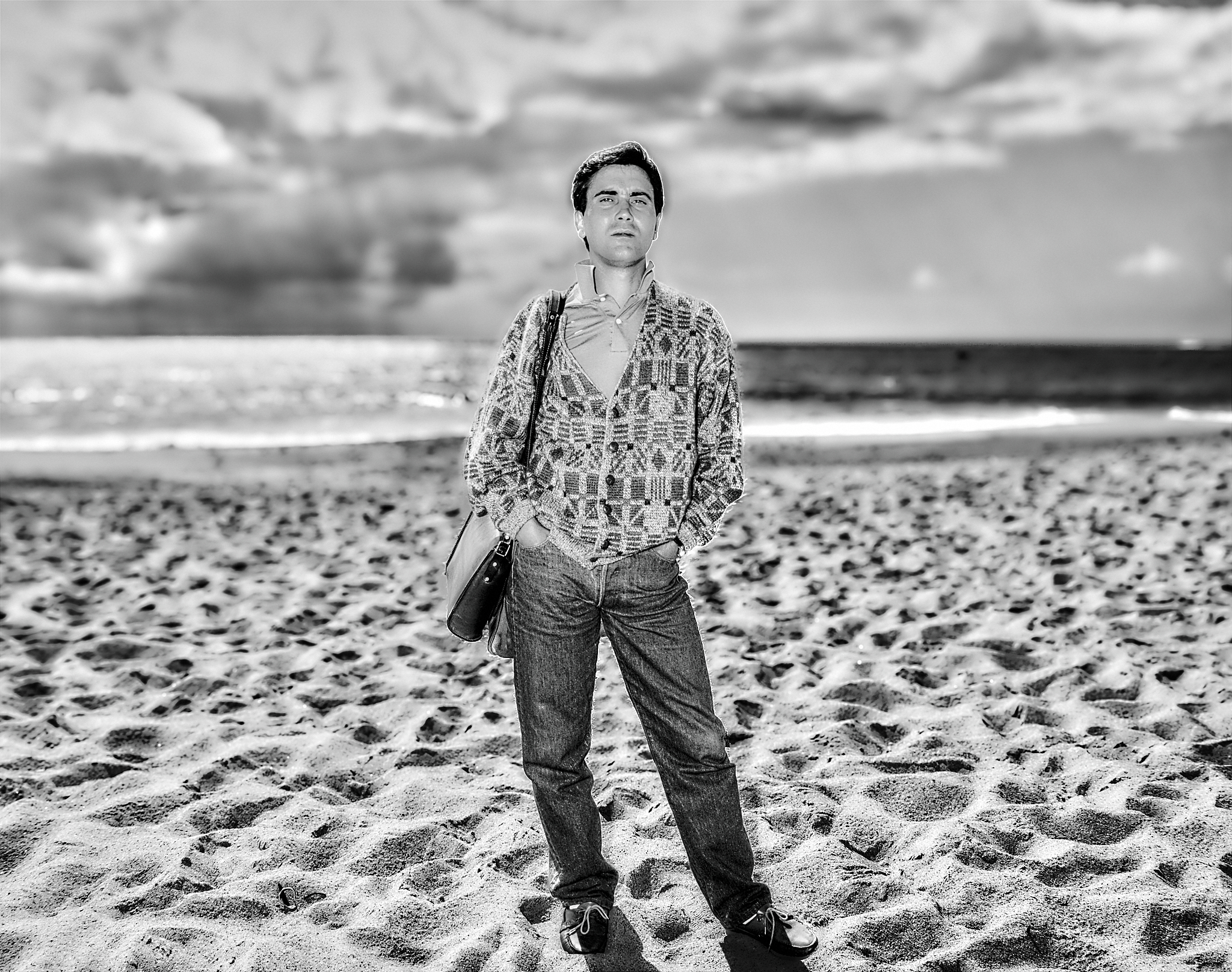 La Fotografía: En aquel viaje, el primero de todos a Lisboa, después de pasar unos días en la ciudad blanca, mi amigo Josito, el alma del periplo (yo solo conducía) ascendimos costeando hacia Nazaré (121 Km); llegamos a media tarde, me acuerdo bien. Tomamos una habitación en un hotel de la ciudad y después bajamos a la playa que me impresionó por su belleza, la luminosidad del mar con la luz del atardecer titilando entre nubes. Mi amigo, en una de sus poses características, como si intentara burlar a la realidad con un sutil quiebro de cintura, que era más un gesto de displicencia hacia todo lo que no estaba al nivel de su altura de miras, tan exquisitas y elaboradas. Siempre pensé de él que se pasaba la vida esquivando a la realidad y sus prosaicas exigencias. Por lo que fui sabiendo, intermitentemente, lo consiguió, aunque no sé hasta cuando pudo hacerlo porque la realidad siempre termina alcanzándote. Hace años que no sé nada de él (la última vez en 2005, en la fiesta de cumpleaños de Naty, a la que le invitamos).