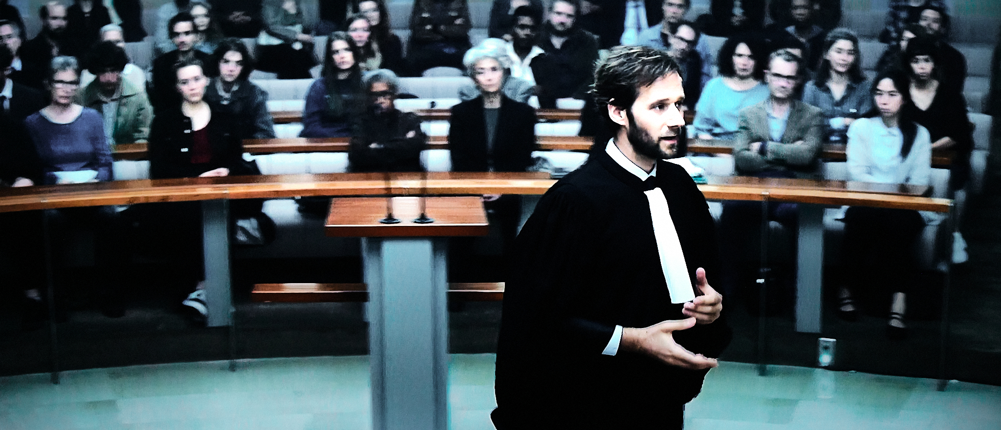 La Fotografía: El abogado defensor en la exposición de los argumentos de la defensa (brillantes). “…No podemos conformarnos con la versión que nos proporciona una sola parte. Aquí no hay una sola verdad, sino dos percepciones de la misma escena. El señor Farel no ha dejado nunca de reivindicar su inocencia y muy consciente de ello estoy hoy aquí para pedir su absolución, lo único que estoy pidiendo es que se haga justicia, una justicia que impartirán ustedes, y mi única ambición es convencerles de su inocencia a ojos de la ley y no de la moral y la clave aquí está en el consentimiento de la señorita Mila Wizman (…) No tenemos la verdad, pero debemos encontrar una verdad judicial. Les han traído aquí para hacer justicia y ahora se encuentran en plena batalla; se les pide que se unan a la causa de la mujer, que se unan a una lucha indispensable. Pero la justicia no necesita guerreros, necesita jueces imparciales. Lo que ustedes deben juzgar hoy son los actos del señor Farel, y nada más. Su tarea no es menos desalentadora, su decisión es la que condicionará el destino del señor Farel. Si finalmente lo condenan porque tienen una mínima duda sobre lo que pasó esa noche entonces estarán violando la ley y traicionaran el juramento que ustedes hicieron como jurados. Ante la duda, no arruinen la vida de un joven que siempre ha mantenido su inocencia. No pueden correr ese riesgo, sería condenar a un inocente”.